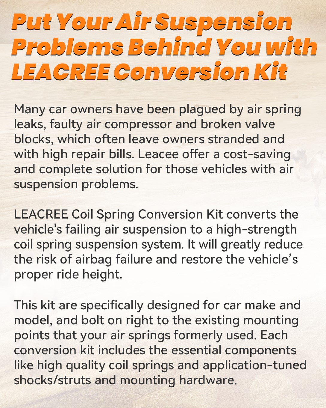 Ntau tus tswv lub tsheb tau plagued los ntawm huab cua caij nplooj ntoos hlav to, faulty air compressor thiab tawg valve blocks, uas feem ntau tso cov tswv tso tseg thiab nrog cov nqi kho siab. Leacee muab cov nqi-txuag thiab ua tiav kev daws teeb meem rau cov tsheb uas muaj teeb meem hauv huab cua. LEACREE Coil Spring Conversion Kit hloov lub tsheb tsis ua haujlwm ntawm huab cua ncua mus rau lub zog siab coil caij nplooj ntoos hlav ncua kev kawm. Nws yuav txo tau txoj kev pheej hmoo ntawm airbag tsis ua hauj lwm thiab kho lub tsheb qhov siab kom zoo. Cov khoom siv no yog tsim tshwj xeeb rau lub tsheb tsim thiab qauv, thiab ntsia liaj qhov rooj ntawm txoj cai rau cov ntsiab lus mounting uas twb muaj lawm uas koj cov cua springs yav tas los siv. Txhua yam khoom siv hloov dua siab tshiab suav nrog cov khoom tseem ceeb xws li cov coil springs zoo thiab daim ntawv thov-tuned shocks / struts thiab mounting hardware.