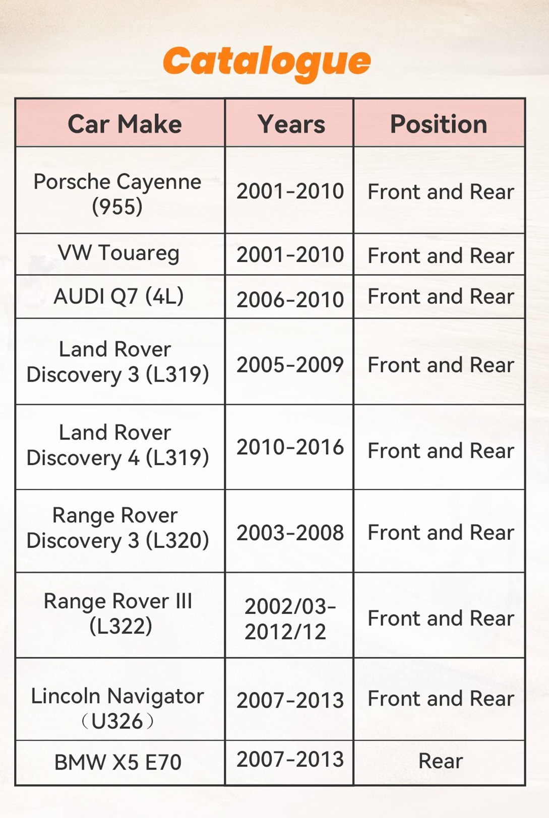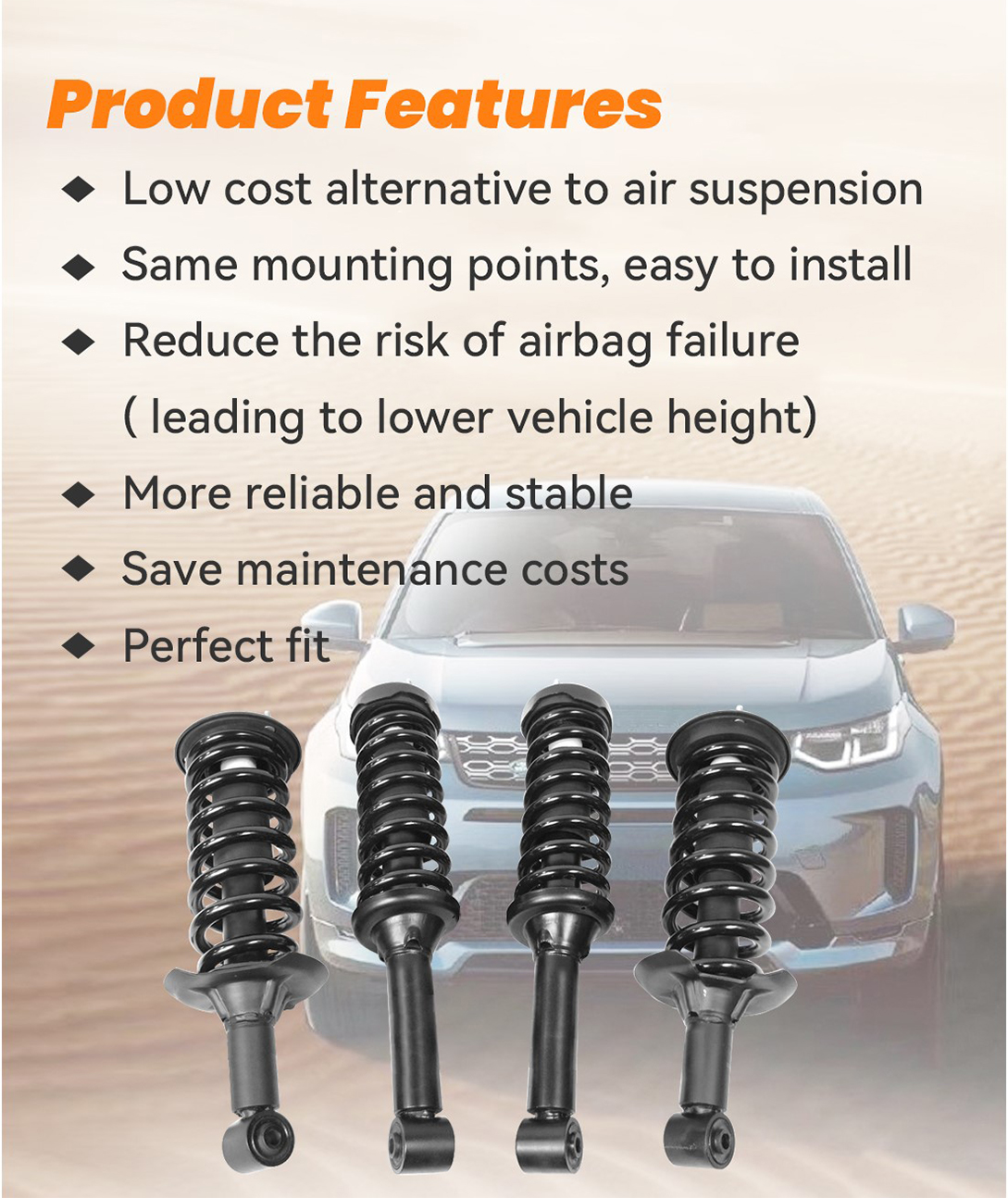 Tom qab hloov peb cov coil caij nplooj ntoos hlav strut hloov khoom siv, lub tsheb qhov siab yuav nce los ntawm qhov tsim nyog 2-3cm. Porsche Cayenne (955) air suspension to coil spring conversion kit, VW Touareg air spring to coil spring conversion kit, AUDI Q7 aftermarket coil spring conversion kit Land Rover Discovery 3/4 Air Suspension Conversion Kit, Range Rover Discovery 3 Suspension Conversion Kits, Lincoln Spring to Conversion Kits , Cua Caij nplooj ntoos hlav rau Coil Spring Conversion Kit
